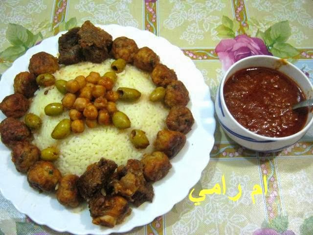 السلام عليكم ورحمة الله وبركاته اليوم نقدم لكم طبق الارز لذيذ مع فكرة جميلة للتقديم نبداعلى بركة الله نحتاج قطعتين لحم او دجاج حسب الموجود وللتزيين حمص وزيتون اخضر الفكرة انك تطيبي المرق بقطعة وتخلي القطعة الاخرى للتزيين على شكل كريات تخلي منظر الطبق يشهي اكثر قطعة للمرق مع حبة بصل كبيرة مفرومة + ثوم + زيت +ملح + توابل نقلي مليح نضيف الطماطم ونمرق نغلق على الكوكوت 20دقيقة من جهة اخرى نرحي قطعة الدجاج ونتبلها مليح ونضيف بيضة وملعقة فرينة وملعقتين كبيرتين ارز طايب ونشكل كويرات نرمدهم في الفرينة ثم نقليهم بعد ما يطيب المرق ناخذ منه حوالي مغرف نضيف اليه كمشة حمص وزيتون اخضر وكريات الدجاج المقلية ونتركهم على نار هادية حتى ينشفوا من المرق ونخلي المرق اللي في الكوكوت يغلي حتى يصبح صلصة خاثرة وحذاري ماتكثروش الملح الارز نستعمل الارز الاصفر المفور هو الاحسن نغسل كمية من الارز حسب عدد افراد العائلة خمس مرات او ست حتى يصبح الماء شفاف نغليه في ماء وملح وشوية زيت حتى يقترب من النضج ثم نضعه في كسكاس ونسكب عليه الماء بكثرة نميل الكسكاس ونخليه يقطر مليح مليح نرشه بشوية ملح ونفوروه ونغطيه حتى تصبح حبة الارز كبيرة وطرية نضع الارز في صحن ونضيف اليه مرغرين او زبدة ستار ونخلط ثم نقلب الارز في صحن التقديم نزينه بالحمص والزيتون وكريات الدجاج وقطع الللحم او الدجاج الصحيحة ويقدم مع الصلصة |