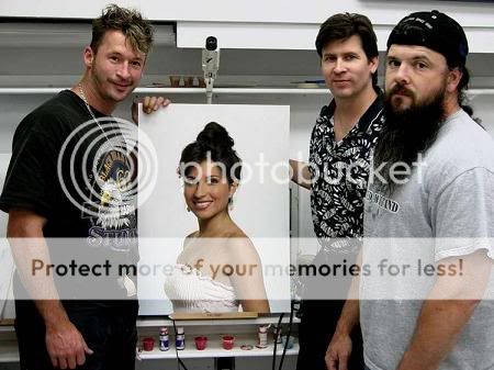 صورة جماعية للفنانين الثلاثة الذين رسموا اللوحة