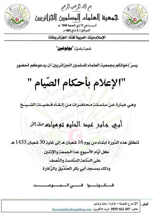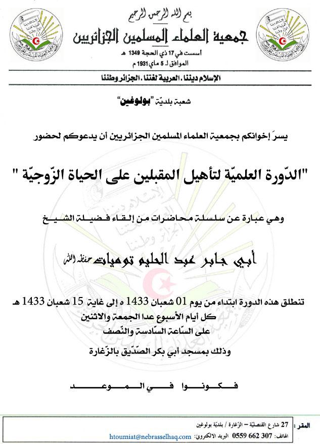 علاما ان الدورة مستمرة إلى غاية النصف من شعبان إن شاء الله والدورة تلقى في مسجد أبي بكر الصديق بالزغارة - العاصمة -
