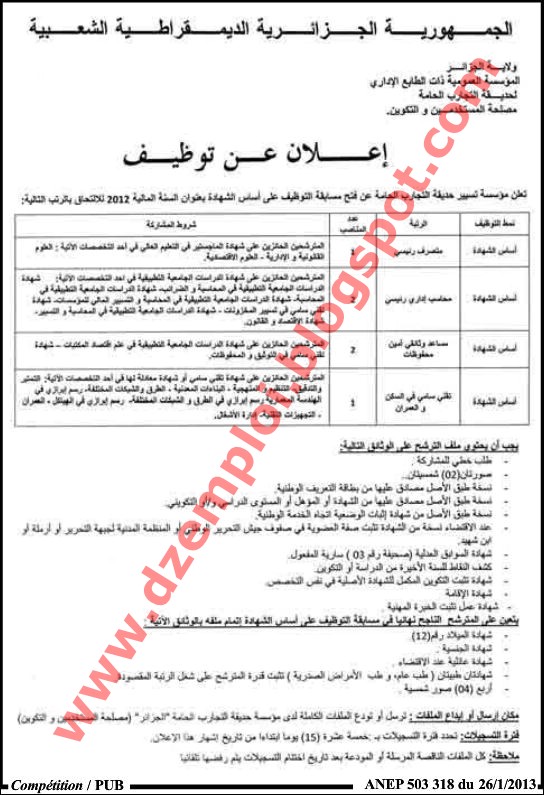 اعلان مسابقة توظيف بحديقة التجارب الحامة ولاية الجزائر جانفي 2013