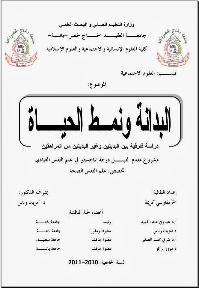 مشروع مقدم لنيل درجة الماجيستير في علم النفس العيادي، تخصص علم النفس الصحة.