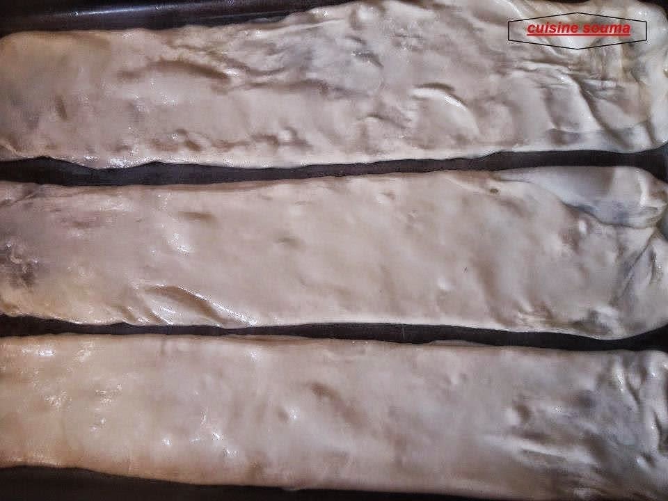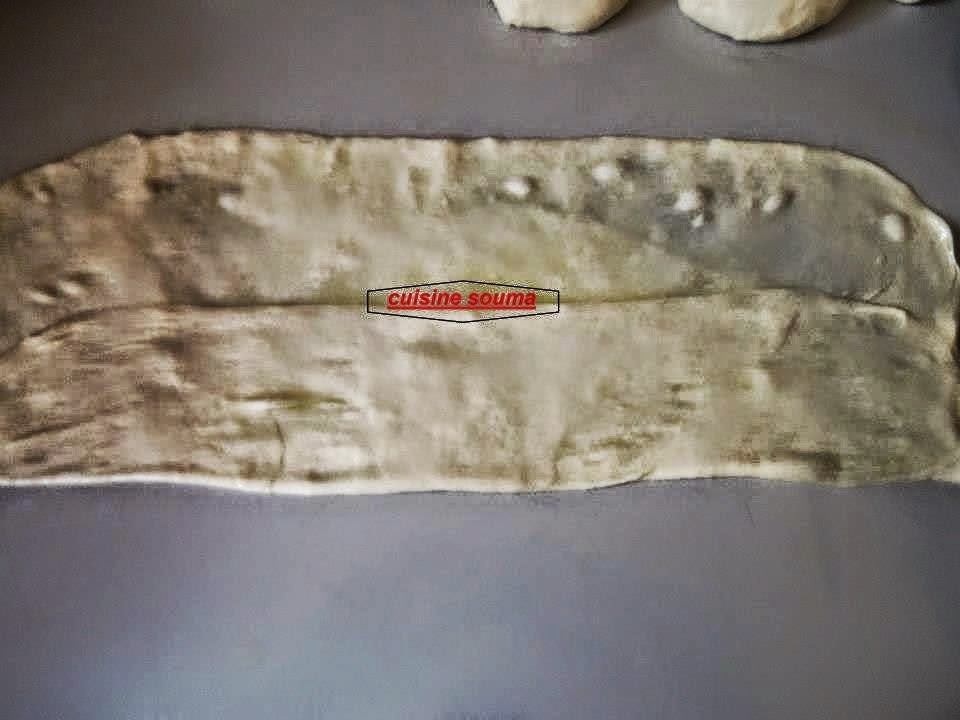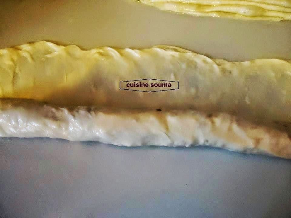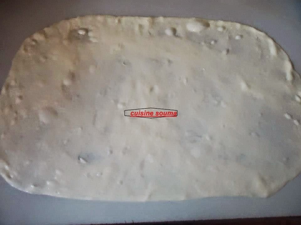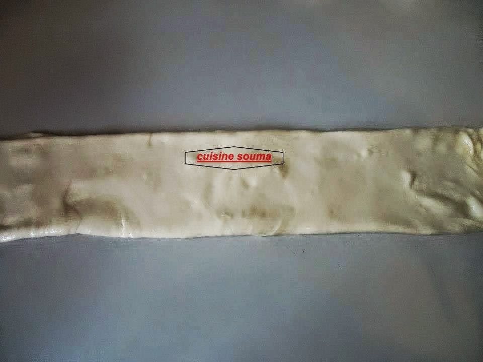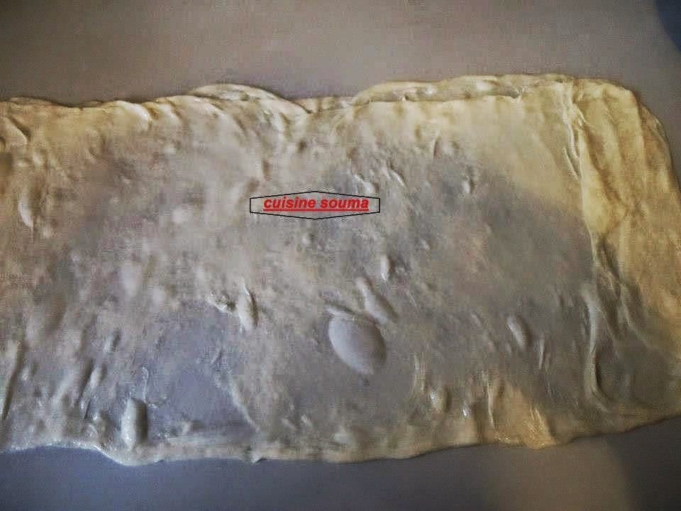 ندهن طاولة العمل بالزيت جيدا نفرد الكرة الاولى على شكل مستطيل ندهن بالزبدة ونطوي كما هو موضح في الصور