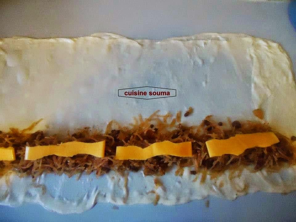 عند الانتهاء من كل الكرات نأخذ الكرة الاولى التي فردناها سابقا نعاود فردها و نضع الحشوة على طول طرف المستطيل مع قليل من جبن السندوتش و نلف حولها العجينة مع شدها قليلا باليد حتى نحصل على لفافة طويلة ثم نكمل تحضير المستطيلات المتبقية بنفس الطريقة