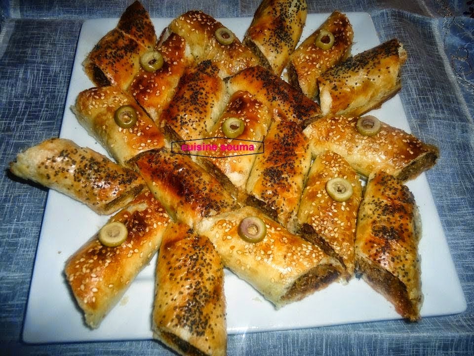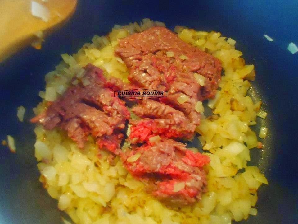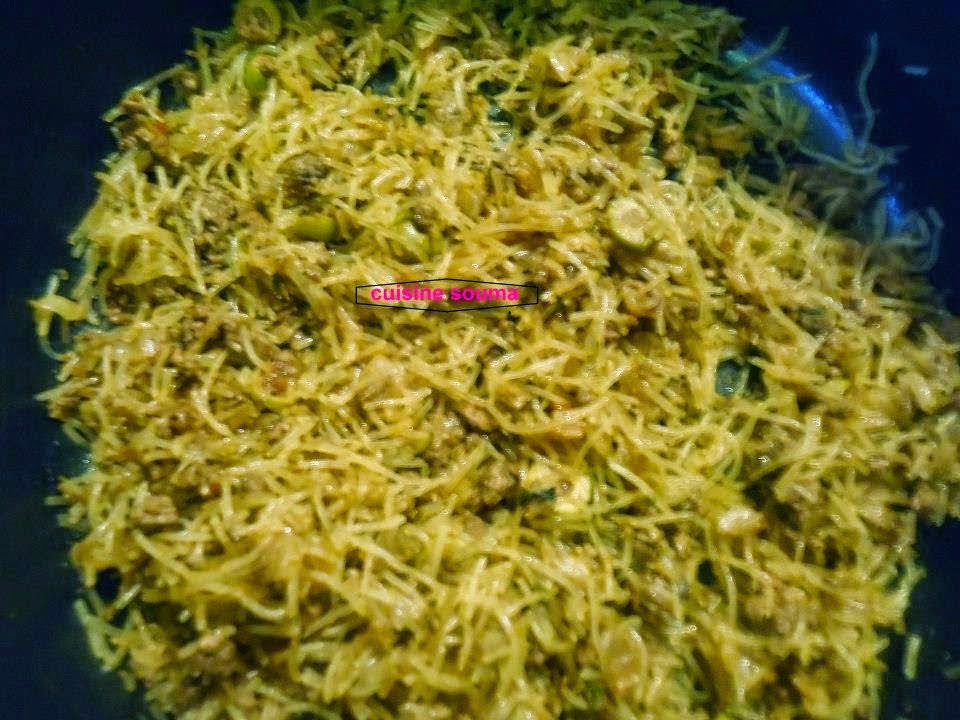 في مقلاة نحمر البصل مقطع في 3 ملاعق كبيرة زيت ثم نضيف 500 غ لحم مفروم و شرائح زيتون أخضر نقلب العناصر جيدا حتى يتفتت اللحم المفروم جيدا نرش البقدونس و الملح و رشة فلفل اسود و قليل من الزنجبيل و القرفة نحرك جيدا حتى تتبخر كل السوائل ثم نضيف الشعرية الصينية نحرك جيدا ونترك الحشوة تبرد جيدا