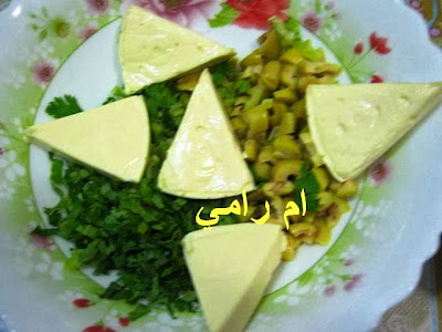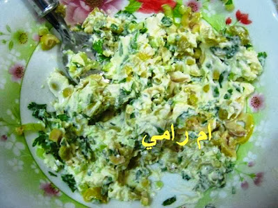نحضر الحشو جبن مثلثات + دبشة مقطعة + فلفل حار وزيتون اخضر مقطعين نخلطهم