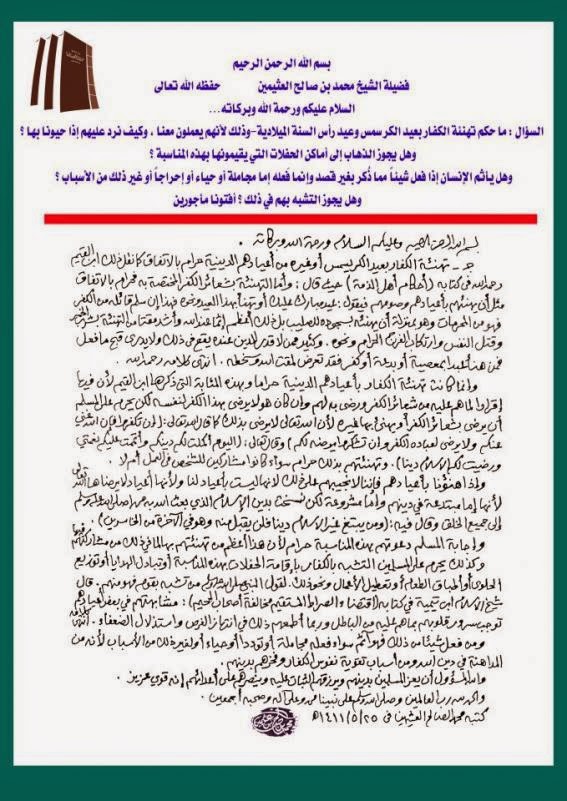 مخطوط حكم تهنئة الكفار بأعيادهم للشيخ محمد بن صالح العثيمين رحمه الله