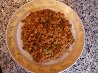 في مقلاة فوق النار يحمر البصل وتضاف اليه الفلفلة والطماطم المحكوكة يخلط الكل جيدا حتى يتقلى