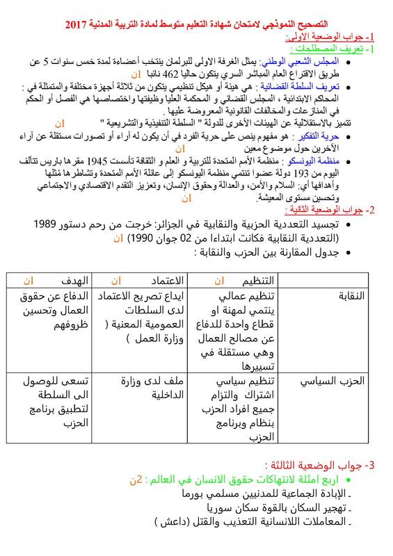 > التصحيح النموذجي لشهادة التعليم متوسط لمادة التربية المدنية 2017
