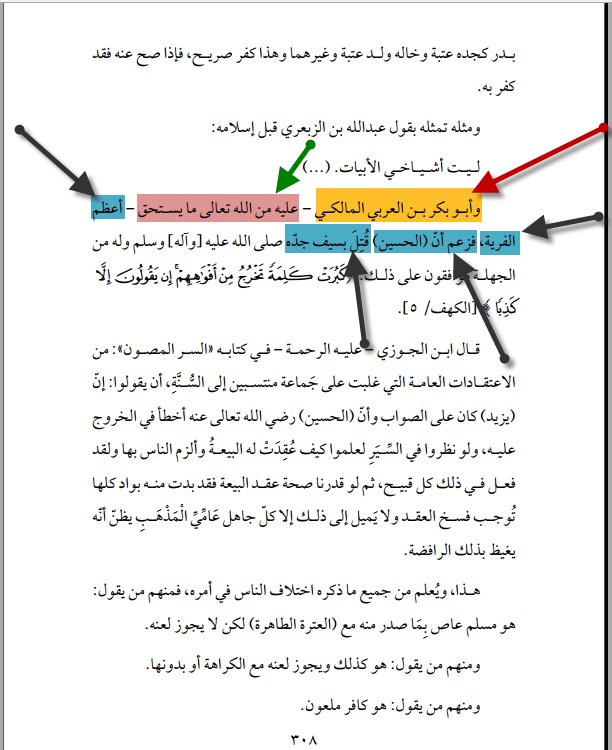 2- هذه المقولة نسبها بعض أهل السنة إلى ابن العربي كالمناوي والألوسي والسيوطي وابن حجر الهيتمي المكي وابن خلدون , ويلاحظ حصول اضطراب في نسبة هذه المقولة إليه , فمثلا قال ابن حجر الهيتمي المكي في ( المنح المكية ) : ( وكابن العربي المالكي فإنه نقل عنه ما يقشعر منه الجلد ، إنه قال : لم يقتل يزيد الحسين إلا بسيف جده ) أ.هـ أقول : لاحظ قوله : ( فإنه نقل عنه ) .وكذا ابن خلدون قال : ( وقد غلط القاضي أبو بكر بن العربي المالكي في هذا فقال في كتابه الذي سماه بالعواصم والقواصم ما معناه أن الحسين قتل بشرع جده ) أ.هـ أقول : لاحظ قوله : ( ما معناه ) .