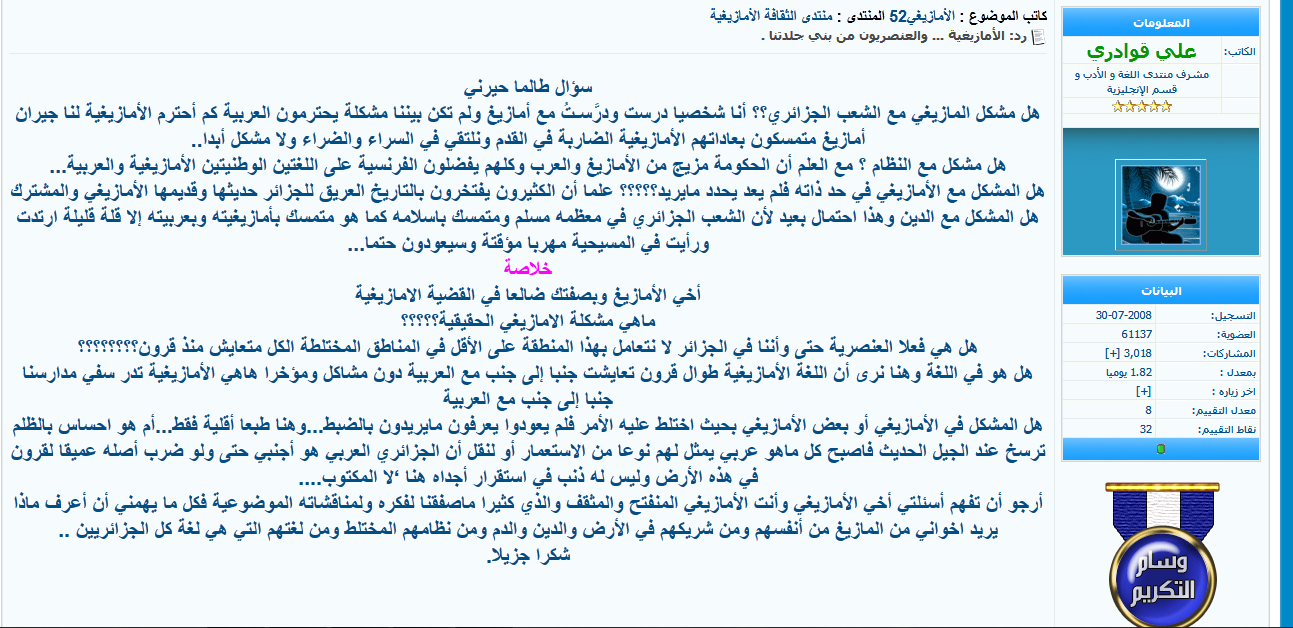 °°° أنا متفهم با أخي ( علي قوادري ) لهاجسك ومخاوفك ، فنحن خلف لمن سلف ، والتواجد العربي في بلاد المغرب صاحب الإسلام ورافقه في دفعة أولى فيها مد وجزر واستقرار نسبي ، دعمتها هجرة هلالية لها مالها وعليها ماعليها أثرث في المكان بالتنوع البشري نسبيا ، وتقديري أن الأمة المهاجرة هي التي تذوب في الأ مة المستقبلة وليس العكس ، اللهم إلا إذا أبيد أهالي البلاد الأصليين كما وقع لهنود أمريكا ؟ !! ، وليكن في علمكم أنا الذي بكنى ( الأمازيغي 52) محدثك ، هو من الذين يقال عنهم الأشراف (وأنا غير مقتنع بذلك طبعا) ، يعني يمكن أن أكون عربي الأصول ، غير أن تواجدي في هذه البلاد الأمازيغية المسلمة جعلني أمازيغيا بقوة الأرض الأمازيغية هي الأرض التي أعيش عليها ، فالإنتساب للأرض [تمازغا] عرفان لهذا الوطن وتبجيل له ، وغير منقص لديني وايماني ، فكثير من المغاربة هاجروا مشرقا أيام حملة المعز الفاطمي فأصبح بعضهم مصريا وآخر سوريا ، وقلما نجد في هذه الدنيا جنسا خالصا غير مختلط .