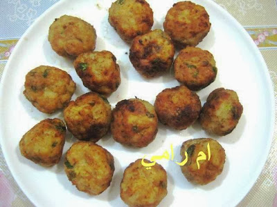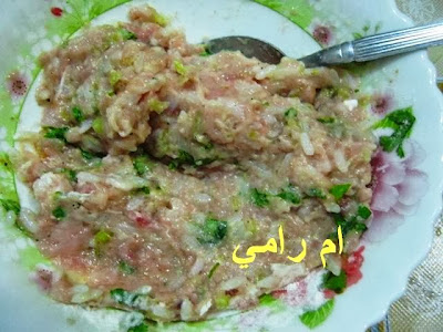 من جهة اخرى نرحي قطعة الدجاج ونتبلها مليح ونضيف بيضة وملعقة فرينة وملعقتين كبيرتين ارز طايب ونشكل كويرات نرمدهم في الفرينة ثم نقليهم
