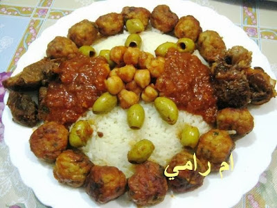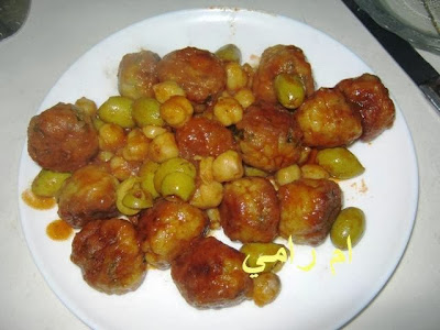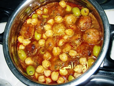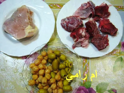نزينه بالحمص والزيتون وكريات الدجاج وقطع الللحم او الدجاج الصحيحة