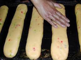 - نضيف الخميرة والدقيق شيئا فشيئا ونعجن الكل حتى نحصل على عجينة منسجمة ومتماسكة نحضر بالعجينة قضبان غليظة ثم نغطيه بالبلاستيك الغذائي وندخلها للمجمد ليسهل علينا تقطيعها