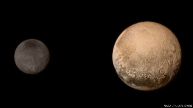 كوكب بلوتو (يمين) وقمره شارون (يسار) الأهداف الرئيسية من المهمة خلال تحليق المركبة "نيو هورايزونز".