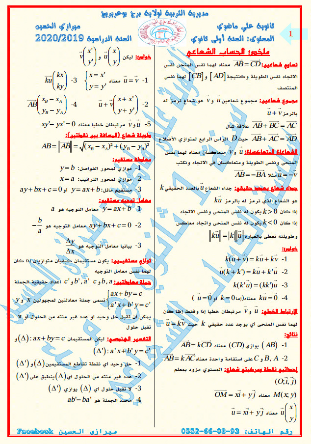 ملخص جيد و سلسلة تمارين في الحساب الشعاعي رياضيات - للسنة أولى ج م ع 1as
