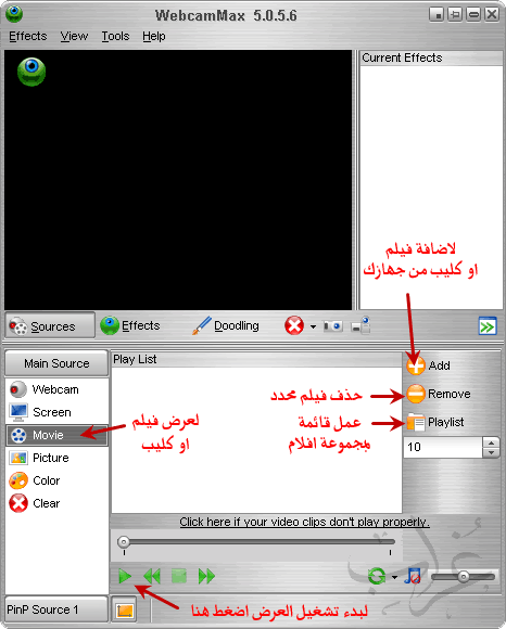 برنامج جميل جدا و يفيد كل من يمتلك ويب كام حيث يسمح البرنامج بعمل تأثيرات رائعة و إضافة كتابات و أشكال و انتقالات رائعة ستبهر من يراك من على المسانجر او اى برنامج آخر .. كما يمكنك اخذ صورة في اي وقت تريد او حتى تسجيل الفيديو ... اما في حالة عدم امتلاكك ويب كام فالبرنامج يعتبر حلاً جميلاً و لطيفاً يمكنك من إضافة فيديو تخادع به اصدقاءك حتى يظنون أنك تملك كاميرا حقيقية و الادهى من ذلك انه بامكانك اضافة مقطع معين من فيلم